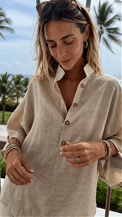 This breathable linen-cotton two-piece set features a relaxed button blouse and wide-leg pants, creating a clean, minimal, and timeless look perfect for any occasion.